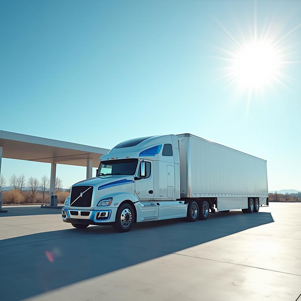 Wasserstoffmobilität 2025 – Zukunft des Schwerlastverkehrs. Wasserstoff-Lkw an moderner H2-Tankstelle als Symbol für nachhaltigen Schwerlastverkehr 2025. Ein moderner Brennstoffzellen-Lkw tankt Wasserstoff an einer futuristisch gestalteten H2-Station. Das Bild steht für die wachsende Bedeutung von Wasserstoff im Verkehrssektor.