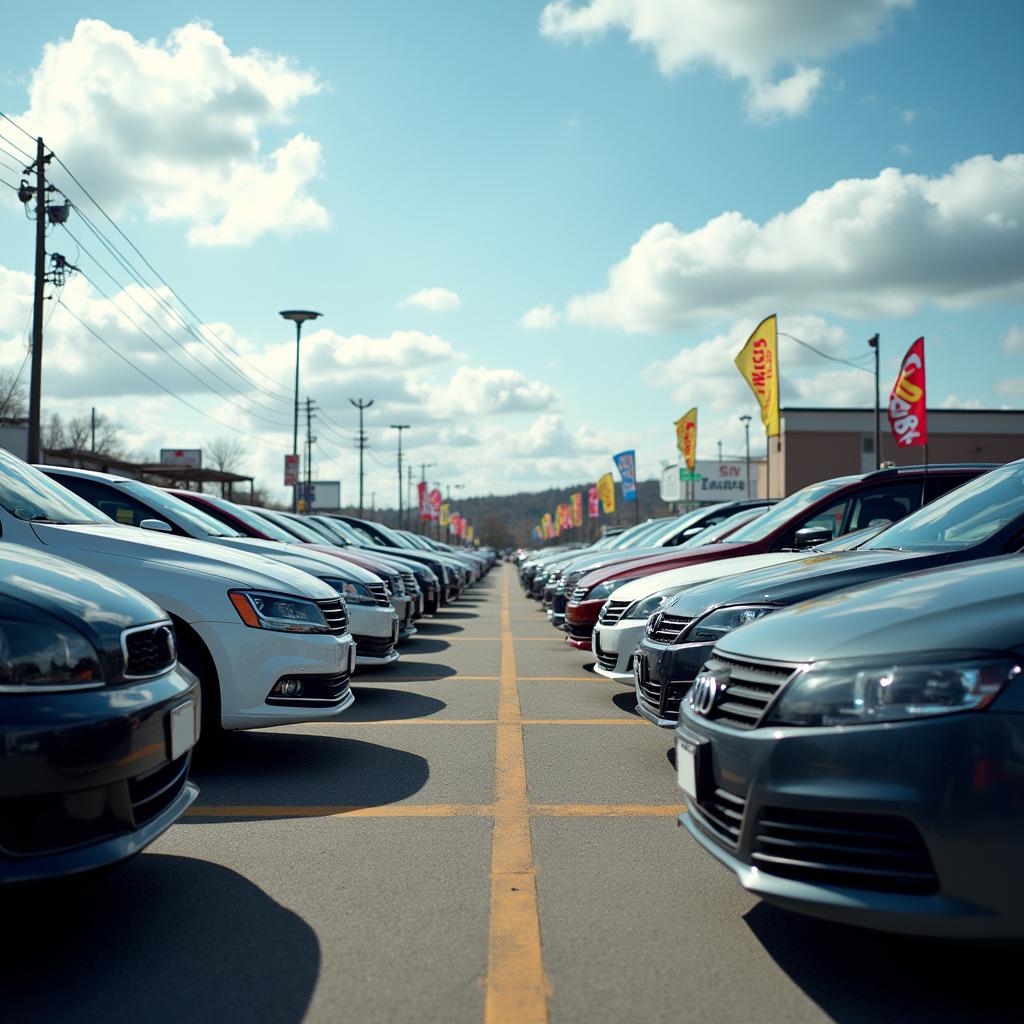 Gebrauchtwagenmarkt 2025 – Analyse von Preisen und Nachfrage. Ein Gebrauchtwagenplatz mit mehreren Fahrzeugen und modernen digitalen Preisschildern. Ein moderner Gebrauchtwagenhandel mit verschiedenen Pkw und digital dargestellten Preisinformationen. Das Bild zeigt die Entwicklung des Gebrauchtwagenmarkts 2025.